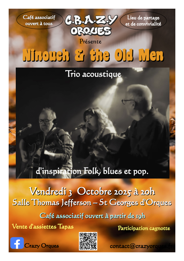 ![]() Le trio acoustique Ninouch & the Old Men vous embarque dans un univers folk, blues et pop, ce vendredi 3 octobre à 20h à la Salle Thomas Jefferson à Saint-Georges d'Orques ! Venez découvrir un moment de partage et de convivialité au café associatif C.R.A.Z.Y Orques, ouvert à partir de 19h. Au programme : Vente […] |