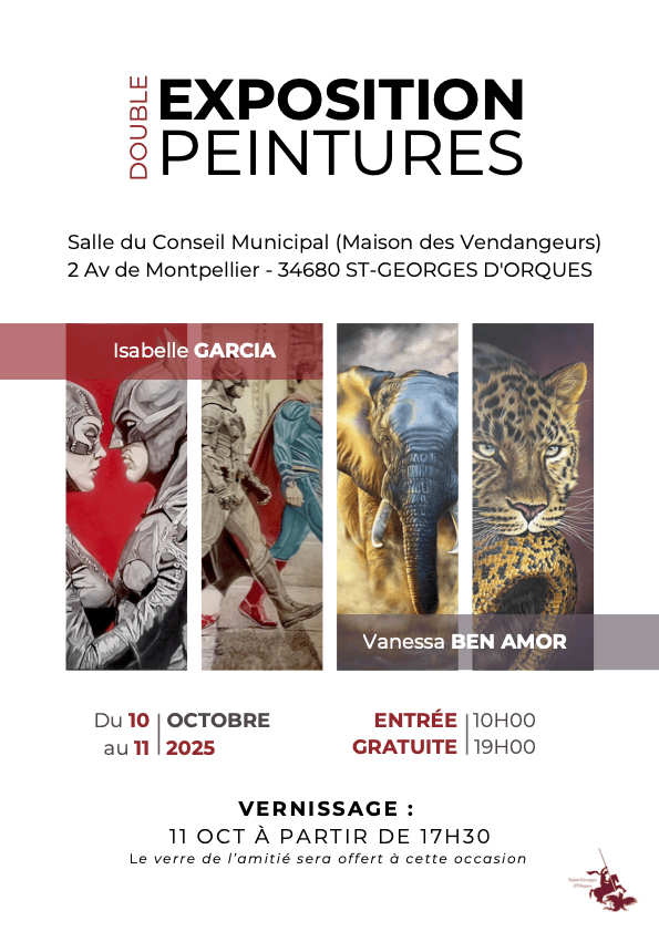 La salle du Conseil Municipal (Maison des Vendangeurs) accueille du 10 au 11 octobre 2025 une double exposition exceptionnelle à Saint-Georges d’Orques !