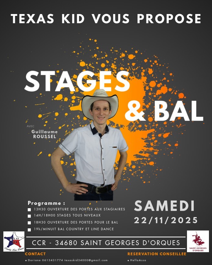 Amateurs de danse, de chapeaux et de bonne ambiance, préparez vos santiags pour les stages & bal Country et Line Dance animés par Guillaume Roussel !