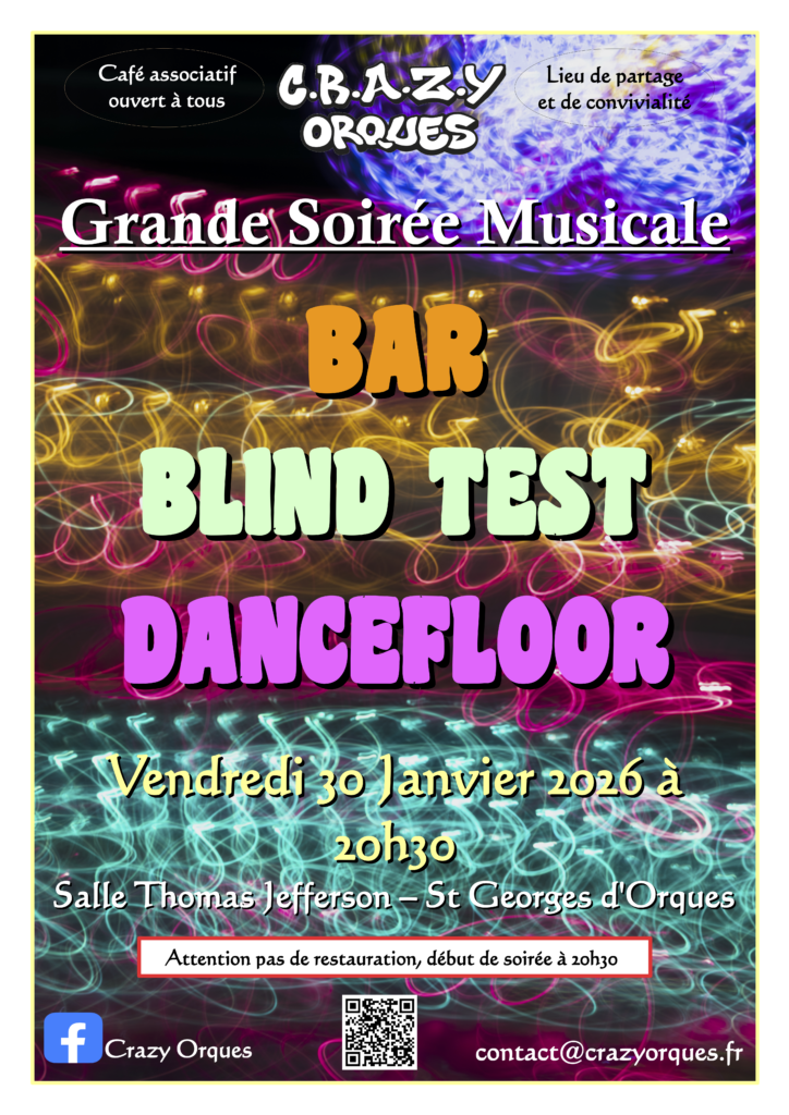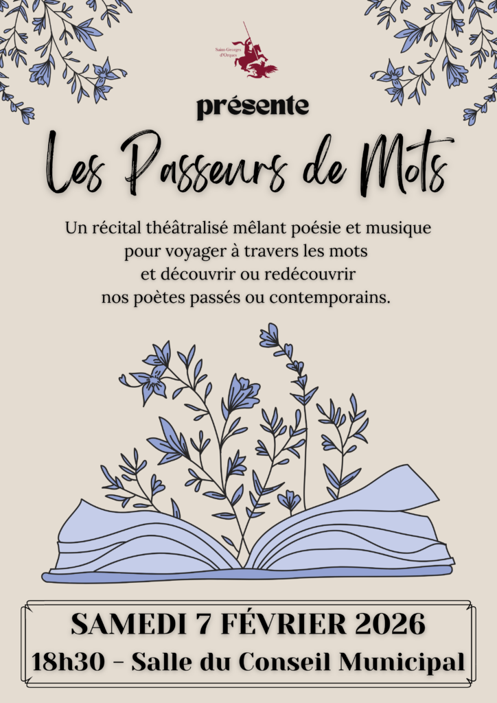 Envie de danser, de tester vos connaissances musicales et de passer une soirée conviviale ?Le café associatif Crazy Orques vous donne rendez-vous pour une grande soirée musicale placée sous le […] La commune de Saint-Georges d’Orques vous invite à un récital théâtralisé mêlant poésie et musique, pour un voyage sensible à travers les mots et les émotions. 🗓 Samedi 7 février […] Parents, proches et professionnels,un temps d’échange et de partage vous est proposé autour des troubles du neurodéveloppement (TND). 🧩 Troubles DYS (dyslexie, dyspraxie, dysorthographie…)🧩 Trouble du spectre de l’autisme🧩 Trouble […] La commune de Saint-Georges d’Orques vous invite à découvrir l’exposition photographique« Regard sur la Femme », proposée par Nathalie Palacin. À travers son objectif, l’artiste interroge, révèle et met en […]🎶💃 Grande Soirée Musicale – Crazy Orques 🕺🎶